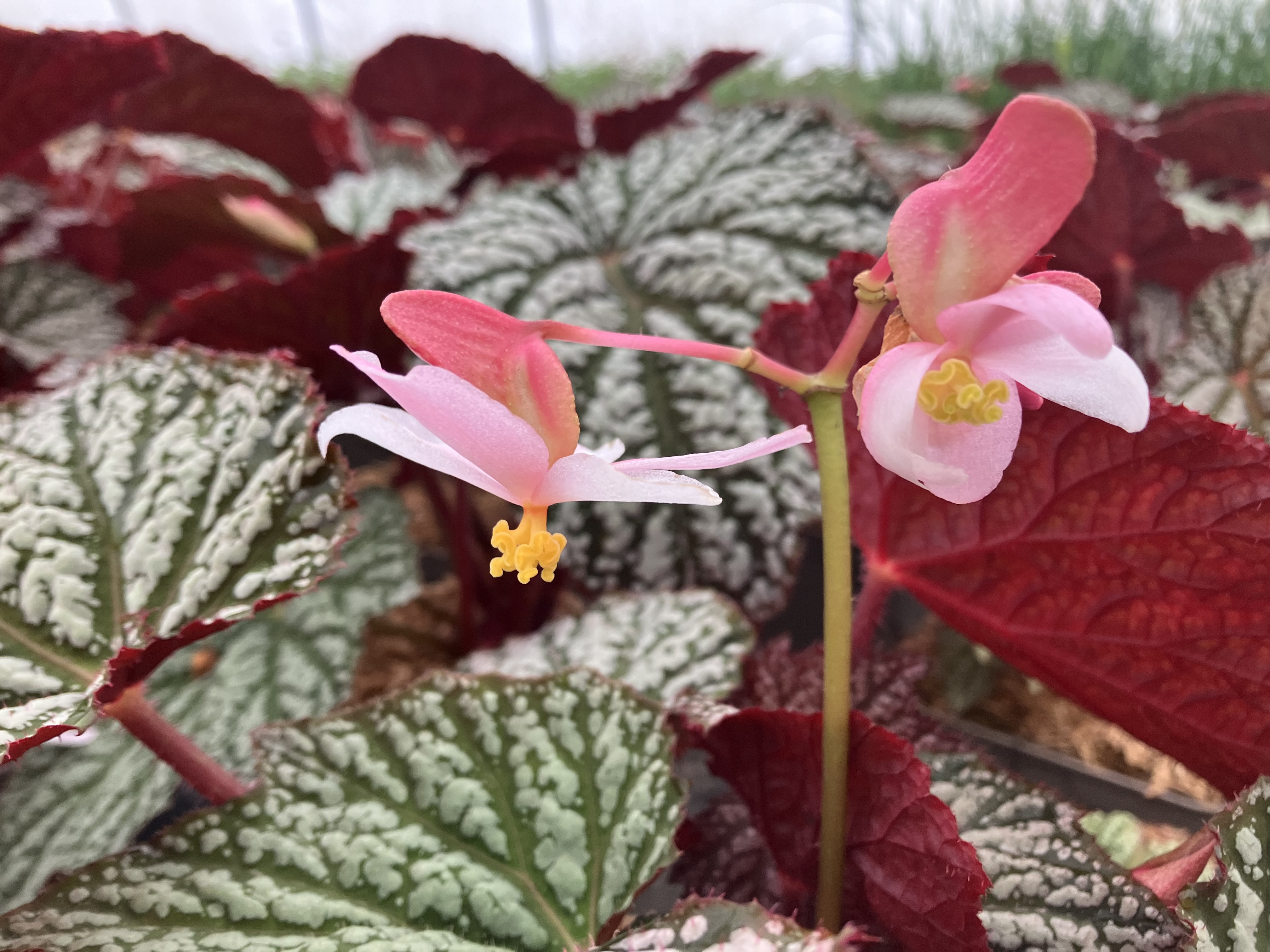 Les feuilles de ce Begonia rustique sont comme saupoudrées de vert pâle et violet argenté: une plante qui brillera dans vos plantations ombragées. Les fleurs roses apparaissent au printemps et en automne.