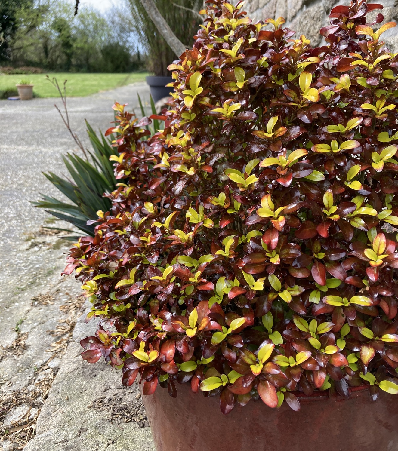 Cette variété offre un feuillage jaune et vert, virant au bronze cuivré aux premiers froids. Ce petit buisson arrondi et dense apporte des couleurs vives au jardin en toute saison.