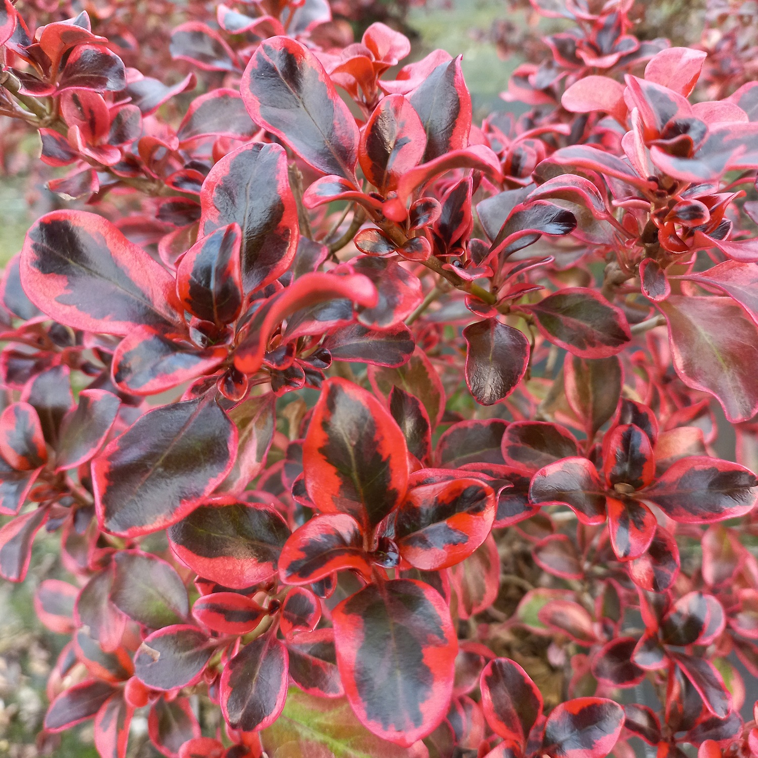 Les températures fraîches d'automne et du printemps font rougir le feuillage de ce Coprosma compacte : ses panachures crèmes et roses deviennent rouge et rose framboise.