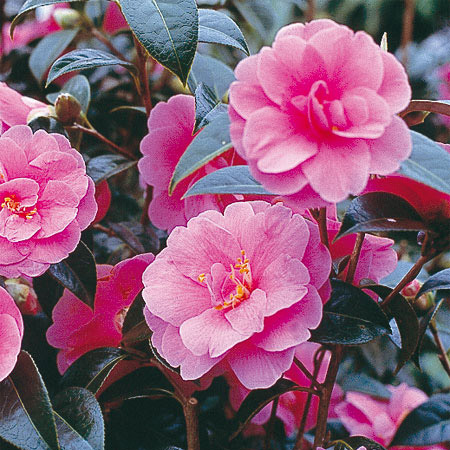 (hybrid) An excellent variety for hedges, shrubberies or staking. Semi-double pink blossoms appear against glossy dark-green foliage for an exceptionally long period, from December to March.
