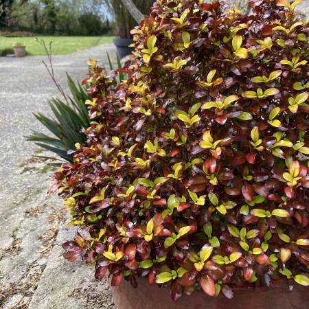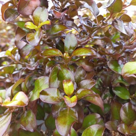 The pretty little leaves of this Coprosma are yellow splashed with orange and green. This small, dense and rounded shrub adds a splash of bright colour to the garden throughout the year.