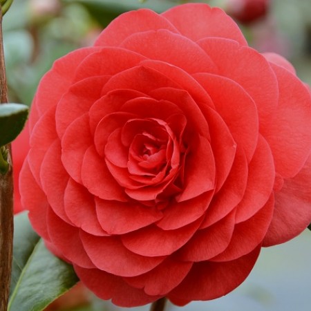 (hybrid) Obtained from Jury, New Zealand, this variety boasts attractive foliage, especially the new shoots of eye-catching brown-red. Large, bright-red, peony-shaped blossoms appear from February to April.