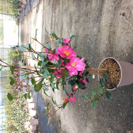 Grande fleur simple à légèrement double rose framboise, à étamines or. Parfumé (septembre - novembre). feuillage vert brillant.